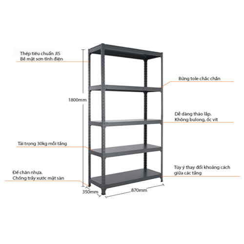 ♦ Bửng tole chắc chắn với tải trọng chịu lực 150 kg (30kg mỗi tầng). Khoảng cách giữa các tầng có thể điều chỉnh tùy ý.