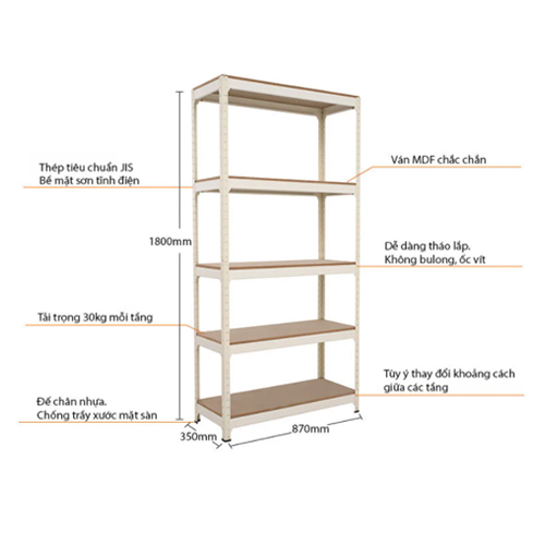 ♦ Bửng ván MDF chắc chắn với tải trọng chịu lực 150 kg (30kg mỗi tầng). Khoảng cách giữa các tầng có thể điều chỉnh tùy ý.