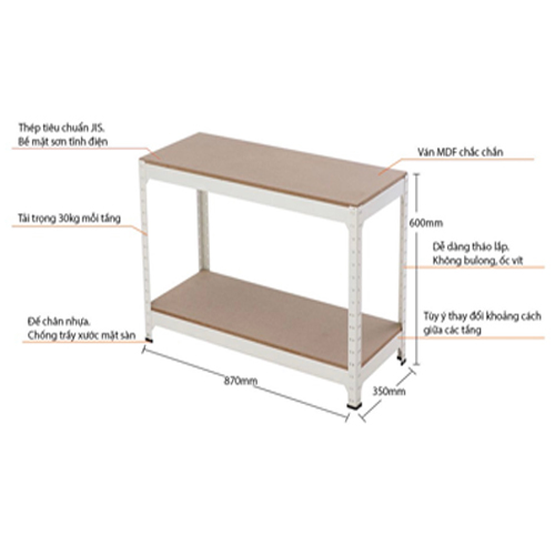 ♦ Bửng ván MDF chắc chắn với tải trọng chịu lực 60 kg (30kg mỗi tầng). Khoảng cách giữa các tầng có thể điều chỉnh tùy ý.